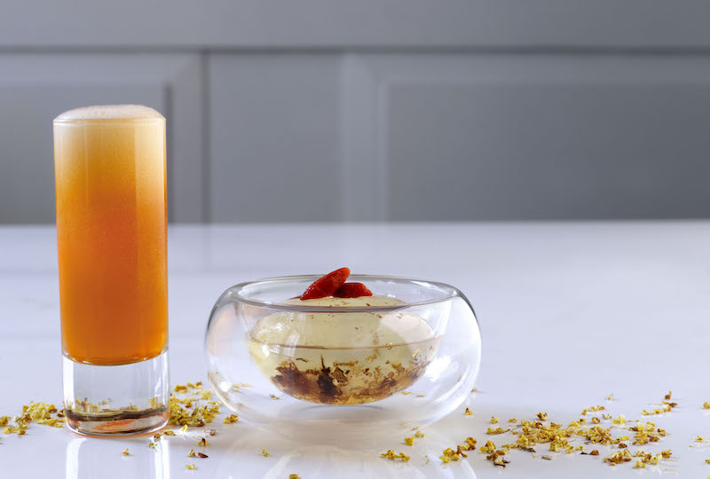 As for heartier plates on the menu, one popular choice is the poulet de bresse ($35), a foie gras and drunken chicken thigh roulade covered by a pleasantly crispy tempura batter and served with popped rice and a purée made of sweet corn and Nu Er Hong. Alternatively, we’d recommend the Chilean seabass ($32) for bites of juicy pan-seared fillet with deep fried enoki that you can drown in a sour and spicy Szechuan sauce.