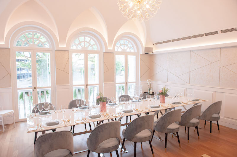 Instead, the cozy second-floor shophouse space is all kinds of elegant, with huge windows ushering in natural light, blue-grey cushioned chairs seated around tables draped with white cloths, and a pastel-hued private room with its own entrance for the Very Important.