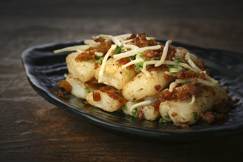 For a spin on har gow ($6/three), the chef made the skin of the prawn dumpling with celery, which sounds like a turn-off, but actually adds a nice flavor to your usual go-to dim sum order. To switch things up, the skewer of grilled pork siew mai ($4.50/three) sprinkled with bonito flakes was reminiscent of takoyaki, but mostly only in appearance. And of course, there was the good ol’ liu sha bao (steamed egg yolk custard bun, $4.50/three), enveloped in a charcoal skin here.