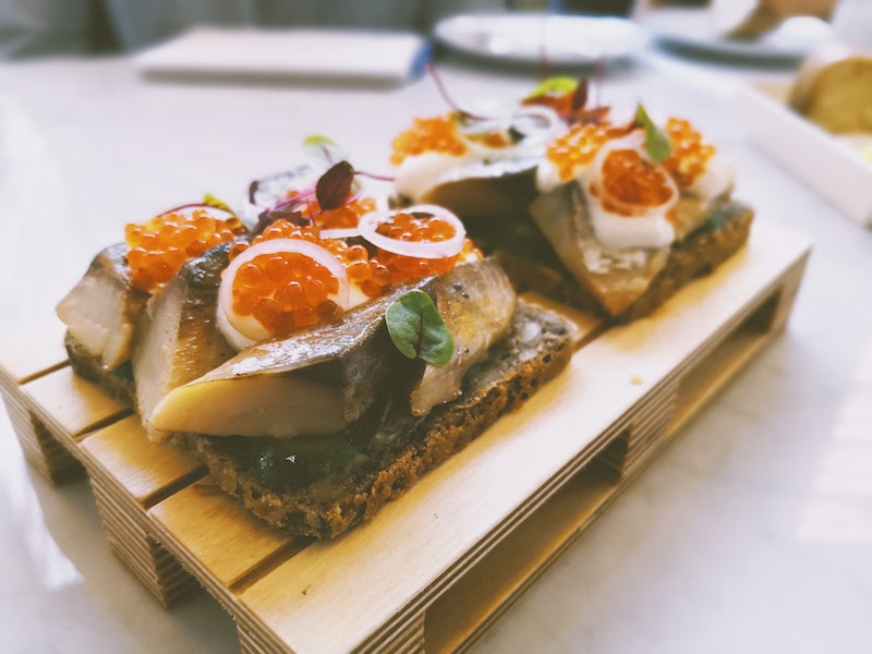 An excursion into the FiSK experience should be launched with the juicy Greenland coldwater prawns on ice ($6/100 grams), naturally delicate and sweet in flavor that is best eaten with your fingers, and with its copious roe nibbled on first. Another lunch must-have would be the smørrebrød ($4-10/piece) — a Danish open-face sandwich made with slices of rye bread spread with organic Norwegian butter and generously topped with options like smoked mackerel, pickled herring, trout roe, and Greenland deep-sea prawns.