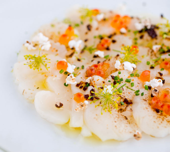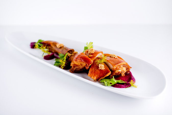 Among the highlights is the seared scallop carpaccio ($18, top photo) — blow-torched scallops topped with ikura, konbu, lime, popcorn and edible flower petals — a beautiful starter marrying sweet and sour. The Big Plates are satiating (and a little heavier on the wallet) so order them to share — the crackling suckling pig ($68), juicy, meaty and swathed in sauerkraut puree, is a winner.