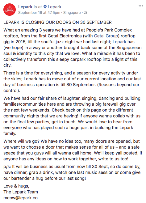 After three years of good times, good music, good food and good vibes, Lepark will close its doors for good at the end of the month. Sept 30 marks the last day of operations for the rooftop bar, restaurant and gig/party venue, due to reasons beyond their control, explained the Lepark team. But it’s not all doom and gloom — there’s always hope that the business will pop up somewhere else.