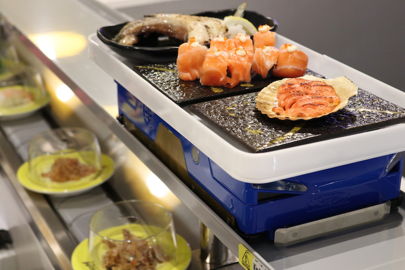 Here, diners can plop down on a chair in the 68-seater space and instantly reach out for their favorite sushi right off the two-tier conveyor belt, or pick up the iPad menu to order items that’ll zoom towards them on a car cruising along the top track.