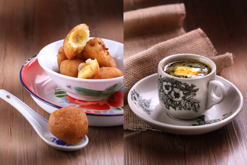 This drink’s combination of butter and black coffee is rumored to be opium smokers’ go-to cup for a throat-soothing swig. As for the banana ball, it apparently has its origins in the breakfasts of early Portuguese immigrants, and the fritters subsequently made their way to street hawkers in the form of goreng pisang.