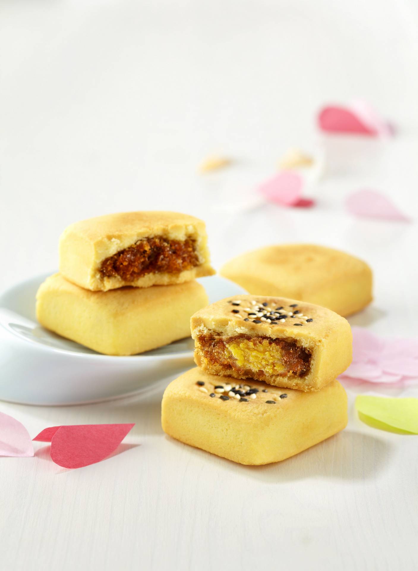 This is the last bak kwa-flavored treat, we promise. Fans of Teochew pastry brand Thye Moh Chan’s tau sar piah (bean paste pastry) can munch on mung bean filling mixed with bits of dried barbecued meat when you try the new Golden Bangle recipe ($18.80/box); otherwise, there’s always Golden Joy’s red bean paste flecked with mochi, spicy pork floss, and salted egg yolk ($22.80/box).