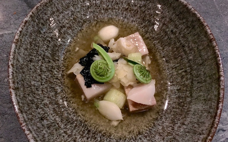 It was only in the third course that amiable Aisbett started to show the sum of his complexities: clear pork dashi broth, when added to a little bed of white turnip puree, transformed into a sauce that brought those seemingly disparate cubes of spoon-tender Mangalica pork jowl, soft Jade tiger abalone, fermented cabbage, white turnips, fiddlehead ferns and seaweed, together. Conversation in the Etta- (James) and Ella- (Fitzgerald) piped dining room came to a crest then.