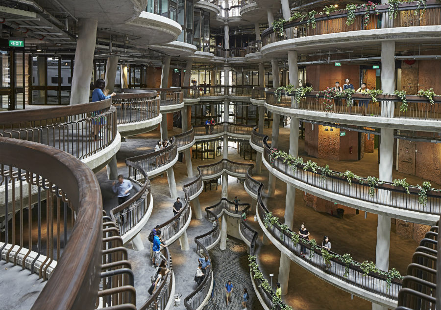 Mimicking the domed shape of beehives, this eight-storey building houses 56 circular rooms without corners, fronts or backs, and meant to break the master-servant dynamic in traditional classrooms. These rooms cluster around a central atrium (see main photo above) with generous corridor doubling as informal study areas, encouraging interaction and collaboration. To rationalise the organic form of the building, modular construction is redefined. The use of pigmented concrete in structure is a first in Singapore.