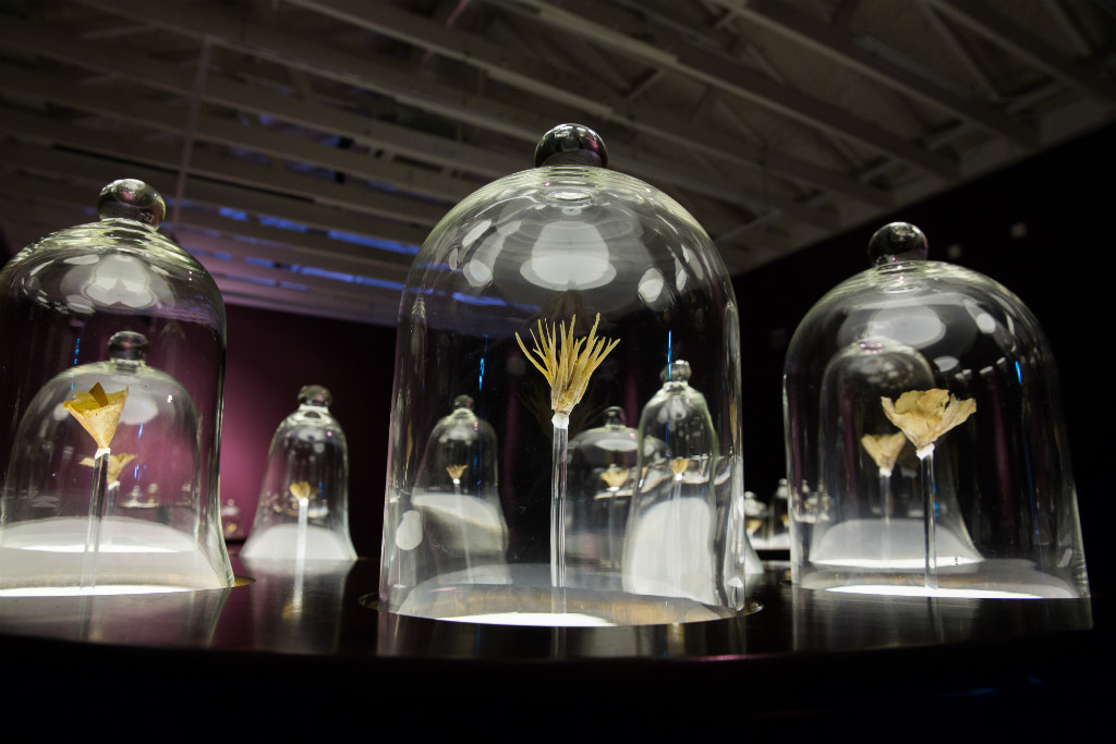 Rahman’s work, “Here’s Who I Am, I Am What You See”, appears to be a delicate flower fantasy contained in 34 glass bell jars, lit up from the inside.