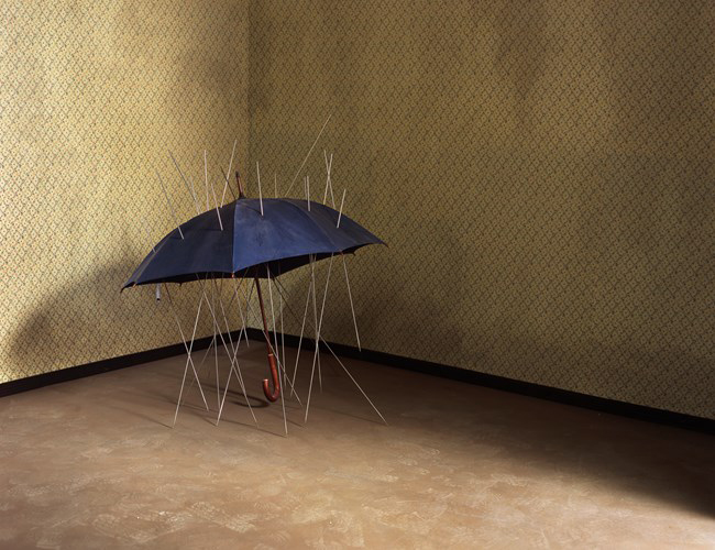 Ota Fine Arts presents Noon Insomnia, a solo exhibition of 12 representative works by the Chinese artist Chen Wei. Within this survey of the artist’s works is the mysterious Rain umbrella, depicting a familiar object in an unfamiliar manner. Photographed in the artist’s studio, long needles puncture the umbrella, rendering the object obsolete. The umbrella stands precariously balanced on its handle and the needles pointing in every direction. This surrealism reveals the beauty in an object being used for something other than its original function.