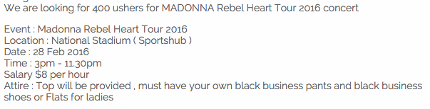 Ok maybe you might not even be watching the show — you’re gonna have to usher ticketholders into the National Stadium from 3pm to 11.30pm, and all for the cool salary of $8 per hour. But there’s always a minuscule chance that you might get a glimpse of Madonna herself offstage and relish the fact that you’re standing in the same room/hallway as her.