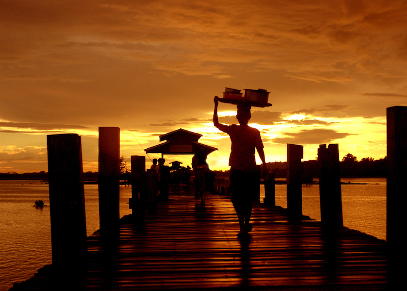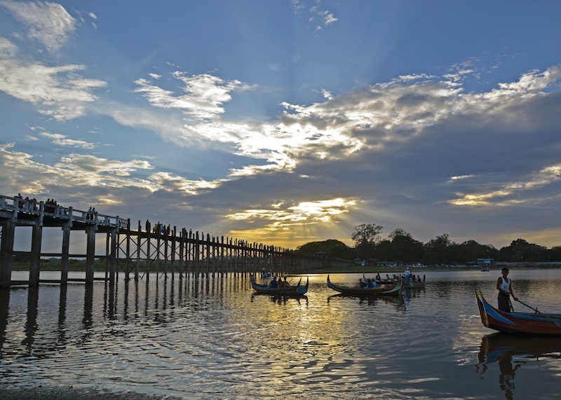 The bridge is surrounded by wide open fields of crops dotted with small thatched-roof huts. On the lake, men wearing traditional longyi paddle boats quietly through the rippled water. They might be ferrying a small group of tourists or fishing for their daily catch. A lot of local activity takes place near the bridge; people park their motorbikes to take walks along the water, locals gather to hang out and share snacks. It’s a great way to be part of the community — even if you’re only in Mandalay for a few days.