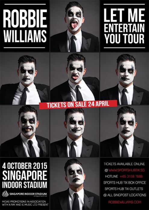 ‘Robbie Williams Let Me Entertain You Tour 2015 Live in Singapore’ is on Oct 4, 8pm, at Singapore Indoor Stadium. Tickets ($258, standing; $358, $288, $208, $138, sitting; $208, $138, restricted view) start selling on Apr 24 vi www.sportshubtix.sg.