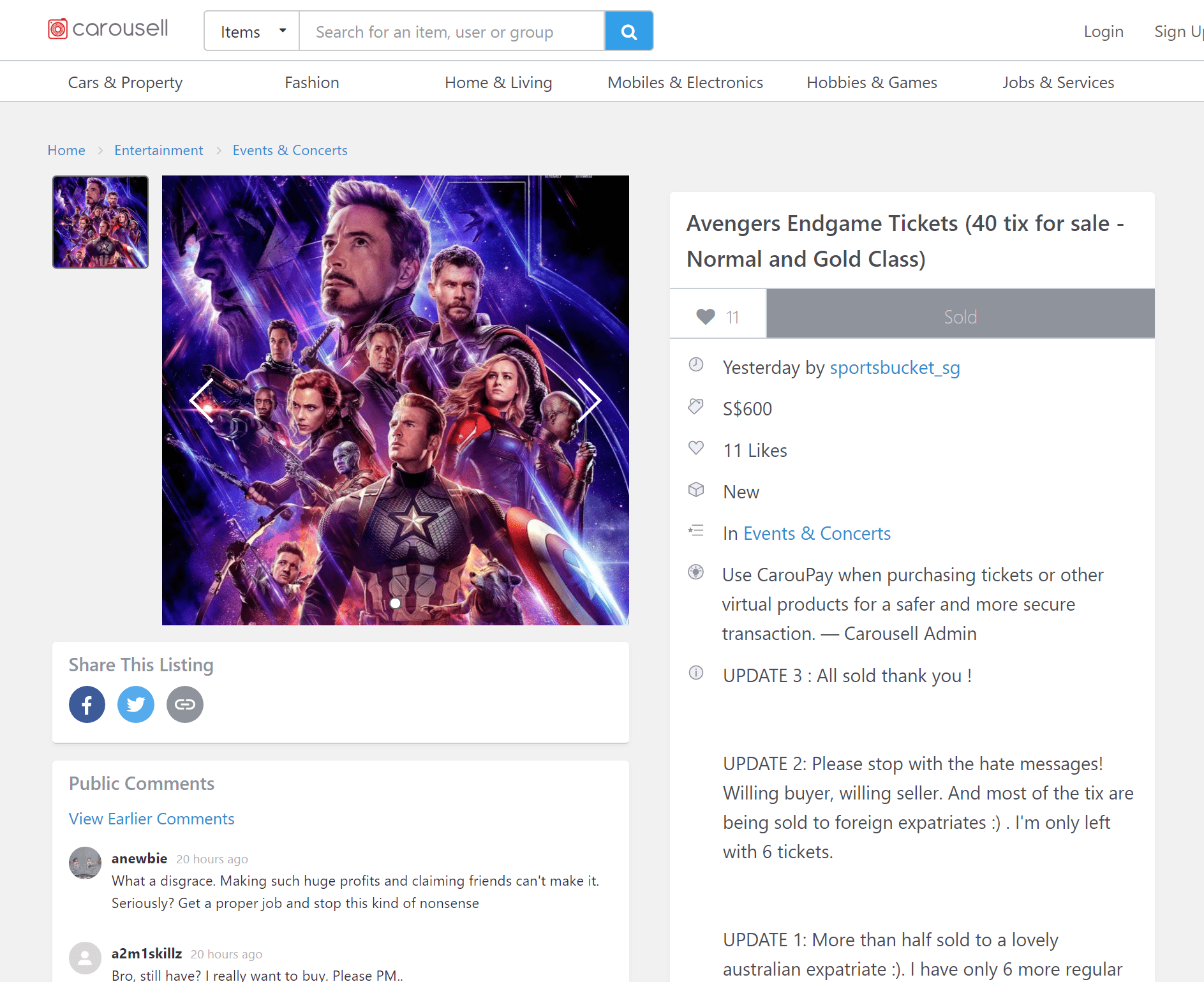 We can’t imagine the sorrow @sportsbucket_sg — a user on online consumer-to-consumer marketplace Carousell — felt when 40 of their friends bailed on them after they had gone to the trouble of purchasing them all ticket to Avengers: Endgame when seats to screenings of the highly-anticipated superhero epic went on sale yesterday (a superhuman feat in and of itself, considering how crazy high demand sent ticket sales sites crashing).