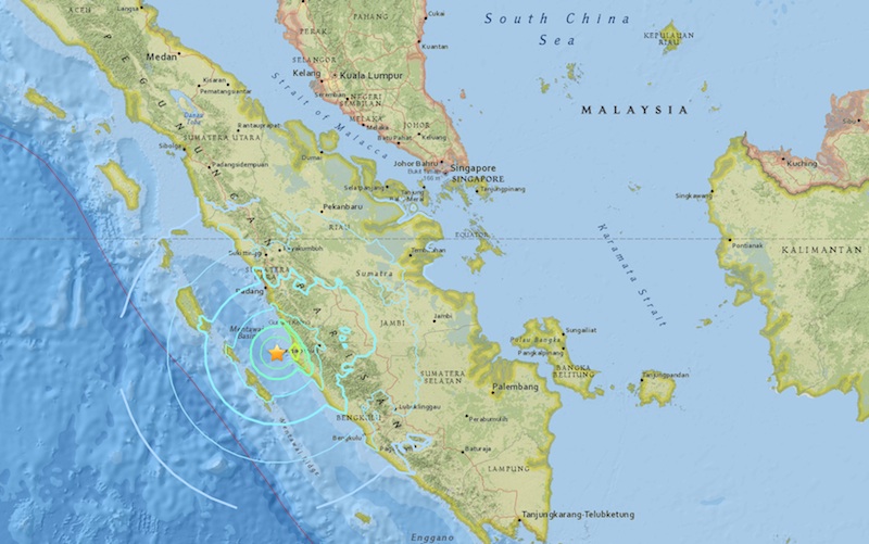In the early dawn hours today, tremors were felt across Singapore after a 6.5-magnitude earthquake was recorded off the island of Sumatra, Indonesia. The US Geological Survey announced that the quake was centered about 155km south of port city Padang at a depth of around 50km. No immediate damages or injuries have been reported.