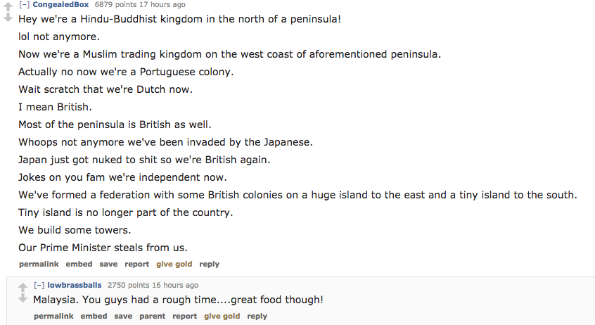 On popular Reddit section /r/AskReddit, a Redditor recently posted a question that regularly gets revived every now and then: “What is the TL;DR of your country’s history?”. In other words, sum up decades and centuries of your country’s formation into a bite-sized, internet-friendly summary.