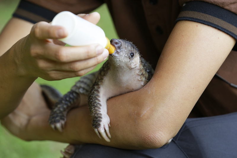 He goes for walks every morning and evening on forested grounds to exercise his sense of smell and develop his strong claws. Now he’s gone from 776g to 1.1kg (adult males can weigh up to 7.5kg), and will soon join the seven other Sunda pangolins at the Night Safari’s Fishing Cat Trail once he’s independent enough.