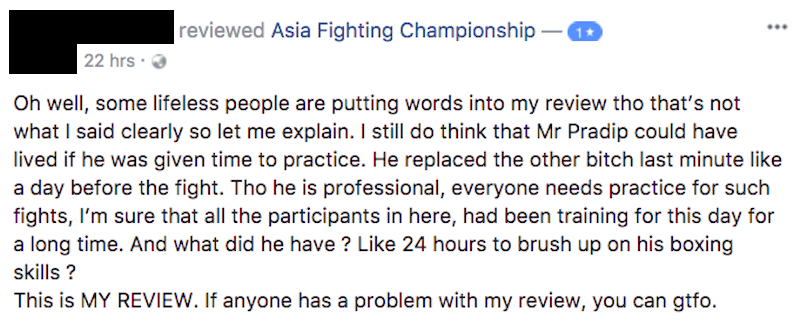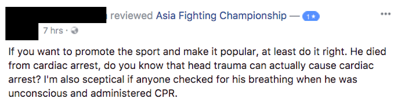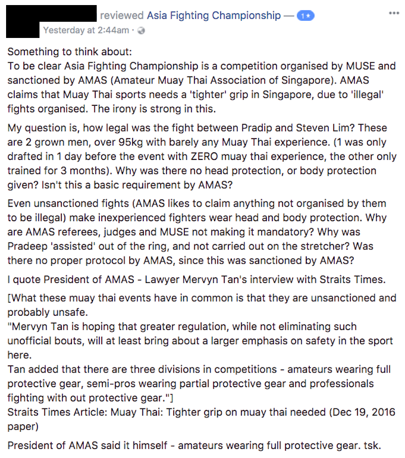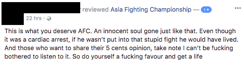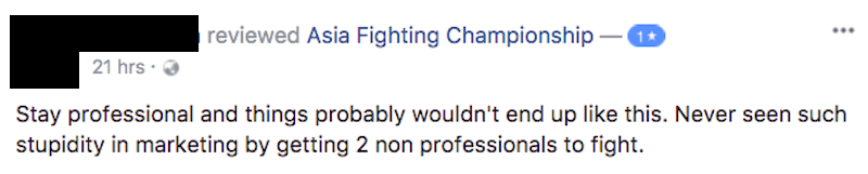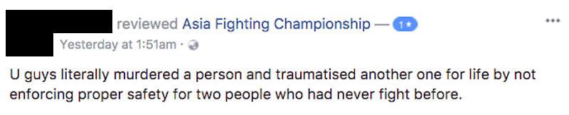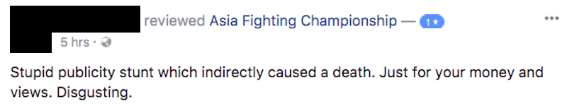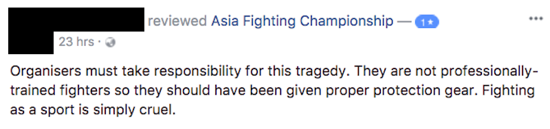 “As a leader in our community, I hope the authorities deal with the CEO of Asia Fighting Championship harshly and severely to deter any other future reckless, irresponsible acts by anyone else.”
