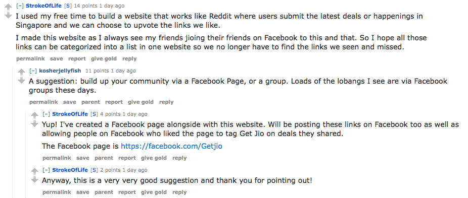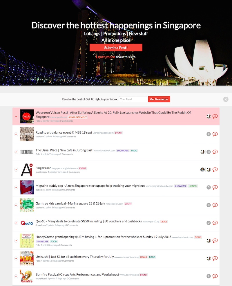 Currently, there are many categories up on Get Jio like Food, Sports, Announcements, and more. Users have posted suggestions on where to get a certain dish, or theatre festivals around town, but Felix says it will expand as the site gets more populated. To gather some advice on how to improve his site, he turned to his board of advisors — the Singapore subreddit.