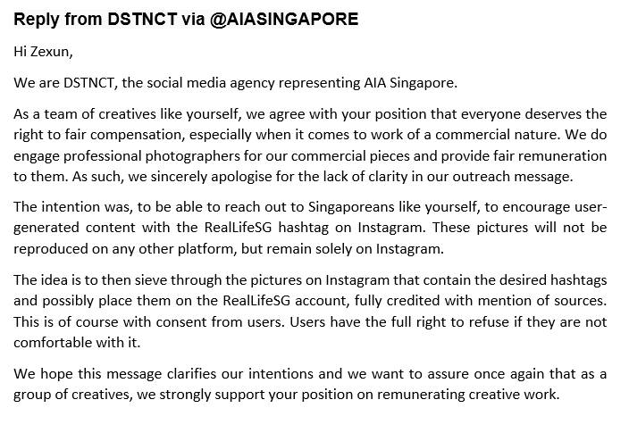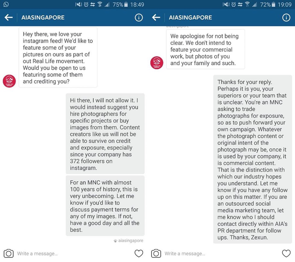 Further follow ups saw the social media agency running AIA Singapore’s Instagram account contacting Tan directly about the viral display of contention. DSTNCT — the agency representing the insurance company — clarified that their idea was simply to run a crowdsourced social media campaign that’ll pick out worthy hashtagged photos on Instagram. They do insist however that professional photographers hired for their commercial pieces are provided fair remuneration.