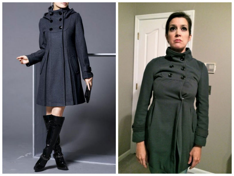 Not only was this “Large” size “woollen gray coat” actually made of fleece, it was “cut for a person with no boobs” and “the sleeves ended far above (the) wrists”.
