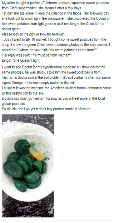 A scare about sweet potatoes from Vietnam purportedly turning green when steamed due to the wartime Agent Orange herbicide is righteously shut down by the Agri-Food & Veterinary Authority of Singapore (AVA).