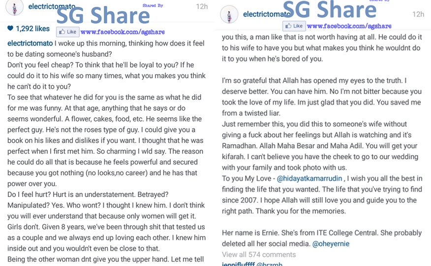 Netizens have dug deeper into the couple’s affair, finding the jilted wife’s now-private Instagram account, where she ranted long and hard about her husband and the girl.