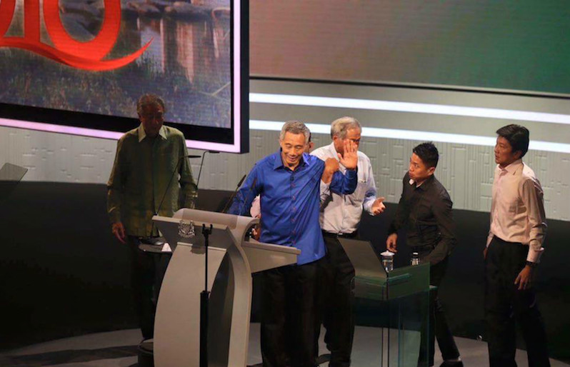 Prime Minister Lee Hsien Loong “took ill” halfway through the English segment of his National Day Rally speech tonight, and the live telecast was temporarily suspended. Watch the footage below as the camera pans away right after he was seen slurring his words and stumbling to the side.