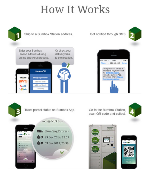 For example, if you would like Bumbox to ship your parcel for self-collection at NUS Business School, key in “Bumbox@ NUS Business School, NUS Business Canteen, 1 Business Link, S117592″ as your delivery address when carting or checking out with your online merchant. Once your parcel is delivered into the Bumbox Station, the Bumbox team also sends collection details to your smartphone.