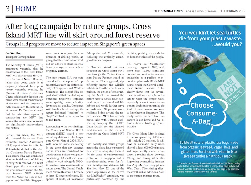 The paper, obviously styled after the format after The Straits Times, functions both as social commentary and motivational literature, but could never be confused with “fake news,” particularly thanks to a ribbon at the top of every page, reading “THIS IS A WORK OF FICTION, NOT A NEWSPAPER.”