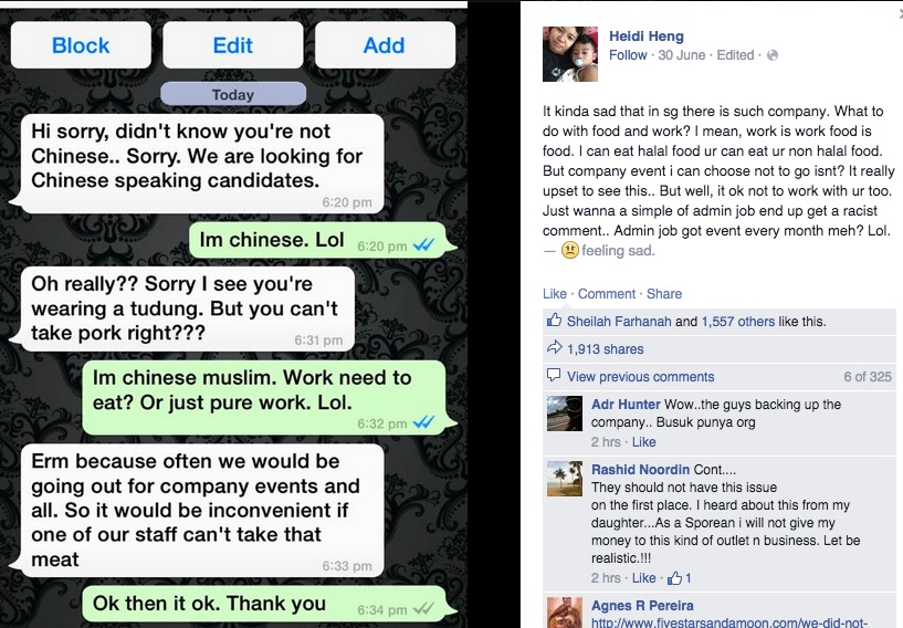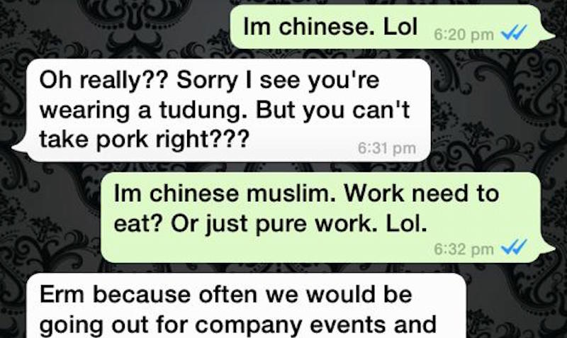 Heng expressed her disgust and disappointment with something that non-Chinese job searchers in Singapore are all too familiar with — employers are mainly looking for Chinese-speaking candidates, and apparently those don’t have dietary restrictions as well. Despite being of Chinese descent herself, Heng then was told that it would be “inconvenient” to cater to her religious requirements of Halal food, especially during company events. Flabbergasted by the outright prejudice, she posted her conversation with the employer on Facebook — and boy has it gone viral.