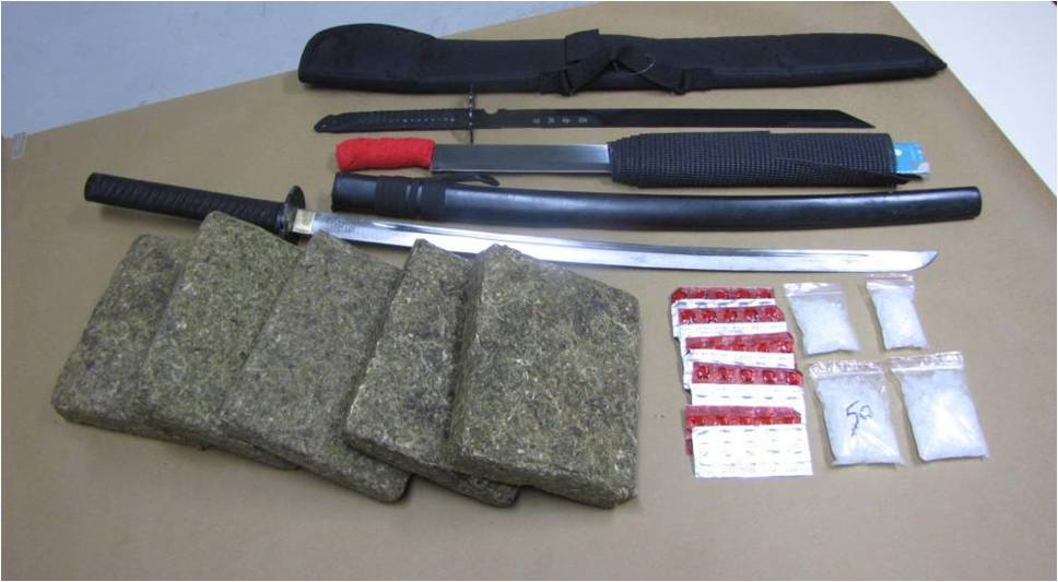 Aside from a huge drug haul of cannabis, meth and Ecstasy pills, the Central Narcotics Bureau (CNB) seized two katanas and a machete from a local drug trafficker in their latest bust.