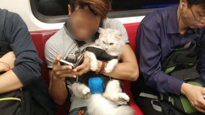 Though strict regulations stipulated by the Rapid Transit Systems Act prohibit commuters from bringing their pets along for a train ride (with a $500 fine to boot), a passenger gave no fucks, strapped his fluffy white cat to a baby carrier and got on a train two days ago.
