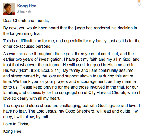 “Please keep praying for me and those involved in the trial, for our families, and especially for the congregation of City Harvest Church, which I love so dearly with all my heart.”