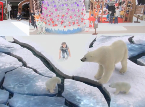 There are about 10 photo and video sections within a 3,500 sq. ft. space in the shopping mall, each with its own unique feature, but the most awesome one it seems, is the one where you look like you’re standing on a cracking glacier, surrounded by moving polar bears. There are even sound effects to make you feel like you’re really in the Arctic.