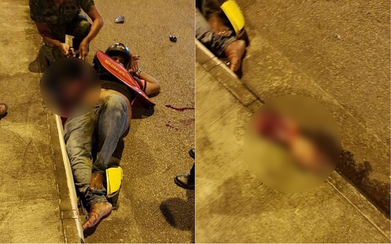In others, the motorcyclist can be seen lying on his back with his hand missing from his right arm, with an individual in a Singapore Armed Forces uniform attending to him. Another photo shows the detached hand (with its pinky finger severed) on the sidewalk.