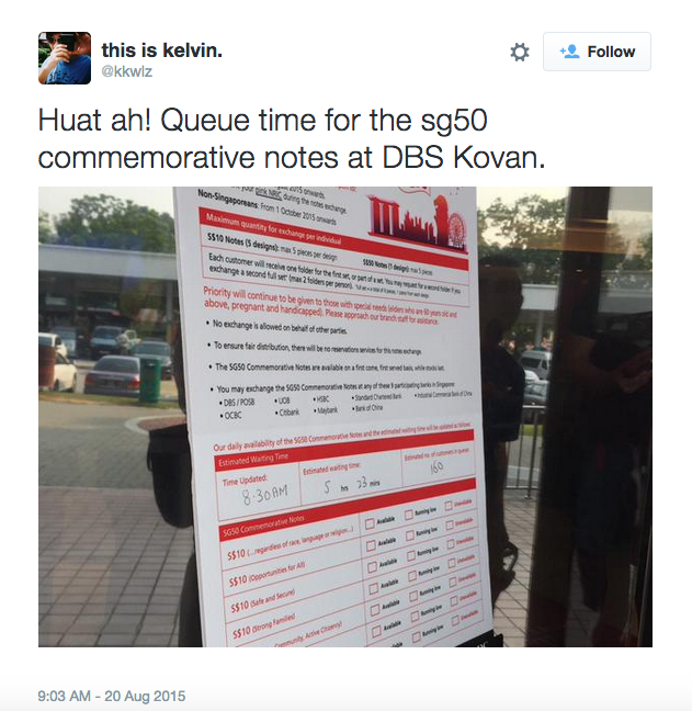 Despite assurances by the Monetary Authority of Singapore (MAS) that there will be “enough SG50 notes available for exchange” for Singaporeans, people have decidedly refused to stand idly by and rushed to various bank branches across the country to swap their money. And of course, they were willing to wait it out even as the estimated waiting time reached over 5 hours.