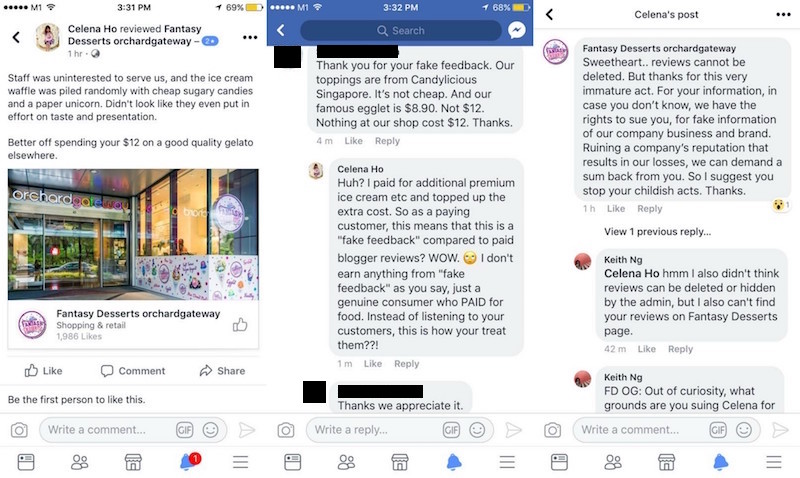 Negative Facebook reviews have plagued many a business owner in Singapore — some of whom unfortunately reacted badly to unhappy customers and turned simple feedback into viral PR fiascos. But it seems a new Orchard Gateway cafe called Fantasy Desserts didn’t take heed of what not to do from its predecessors, because it responded to a bad review with sarcasm, threats to sue and, er, blatant self-promotion.