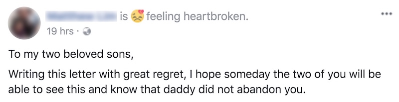 Saying he had nowhere else to turn, a man claiming to be the heartbroken father of two young sons took to Facebook yesterday to offer an excruciatingly intimate portrait of his marriage’s breakdown, a four-year journey that ended with him “accidentally” losing all custodial rights to his kids.