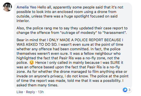 Yeo later updated that the case report was changed from an outrage of modesty offence to harassment, and said she had received feedback that a drone could not look into an enclosed room from the outside without a spotlight. She reiterated that she had lodged a police report because she was asked to do so, even though she was unsure whether an offence had been committed.