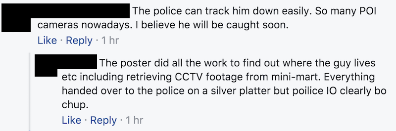 “…thanks to the inefficient, unresponsive, unreliable, disappointing Sengkang (Neighbourhood Police Post) and the assigned (Investigating Officer), the attacker is still happily at home and loitering in the vicinity and looking for the next prey,” she wrote.