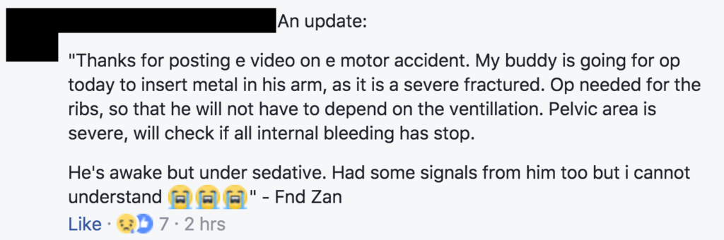 The Roads.SG Facebook page stated that the 46-year-old victim was conveyed to the National University Hospital, and is currently warded in their Intensive Care Unit. The accident itself transpired on May 24 along the Pan Island Expressway (PIE).
