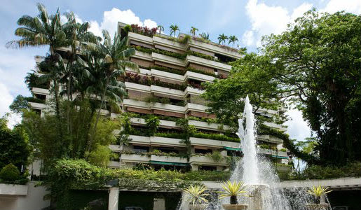 Fire broke out yesterday morning at the carpark of one of Singapore’s wonders, The Arcadia condominium on Adam Road, whose lush vertical landscaping and garden terrace on every floor was inspired by the Hanging Gardens of Babylon. Some 40 residents of the much sought-after address had to evacuate when “the blaze occurred at about 6.45am near a resting room for chauffeurs of condominium residents,” reports The Straits Times. No humans were reported injured, but the front of an Audi car was damaged, as was a section of the carpark entrance.