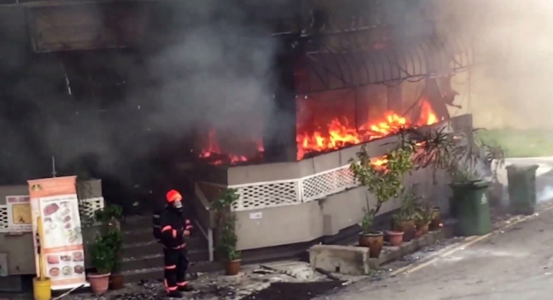 A large crowd — mostly consisting of foreign workers living around the area — gathered around the incident site, located at the junction of Race Course Lane and Serangoon Road. The fire was seen raging at the ground-floor restaurant of the hotel, with flames licking the top of the ceiling and the ventilation air ducts.