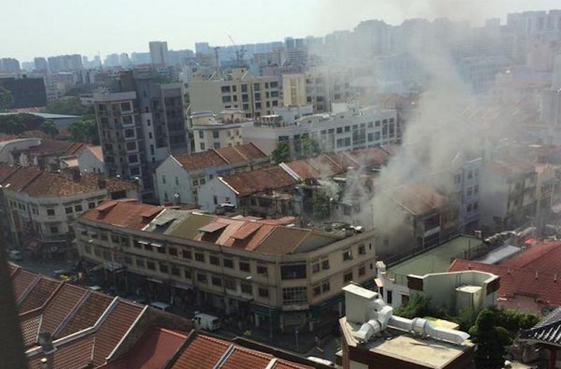 The skies above Geylang were covered with plumes of grey smoke earlier this morning when a fire broke out at a drinks stall in a coffee shop along Lorong 15.