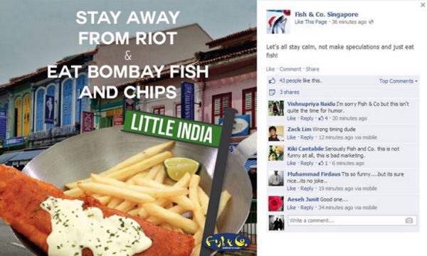 Fish & Co. Singapore issued an apology via its Facebook page on Dec. 9 after its advertisement with reference to the Little India riot drew flak on and offline.
