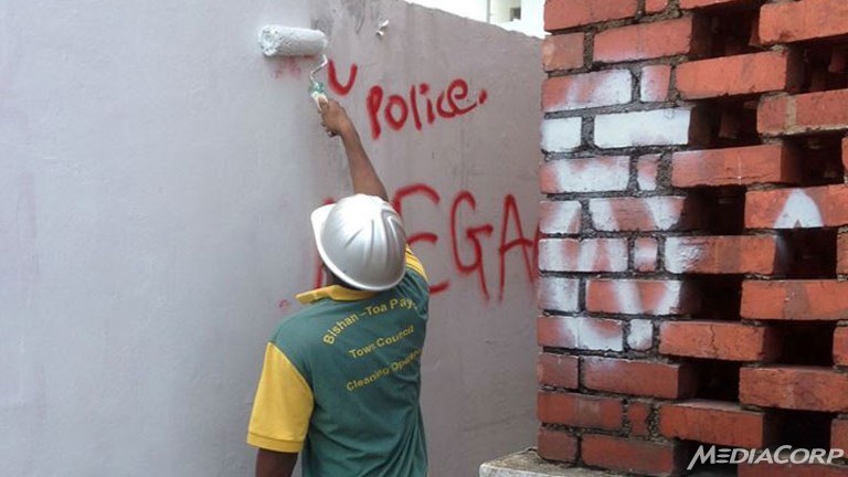 Photo: A worker painting over the graffiti in Toa Payoh; Channel NewsAsia