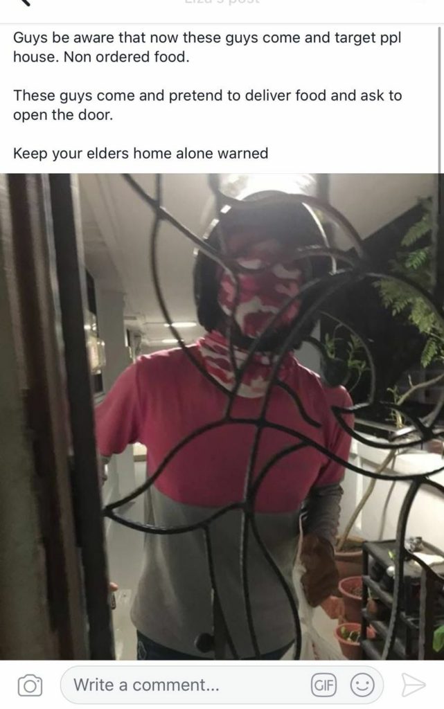 Last evening, a Facebook user shared a post that claimed a man was going around HDB blocks pretending to be a delivery food rider in an attempt to con his way into unsuspecting households. The picture depicted a masked man in a motorcycle helmet wearing a Foodpanda shirt, with the accompanying caption warning folks that “these guys” have been targeting people’s houses — but nothing else was mentioned regarding the mechanisms of the alleged ruse.