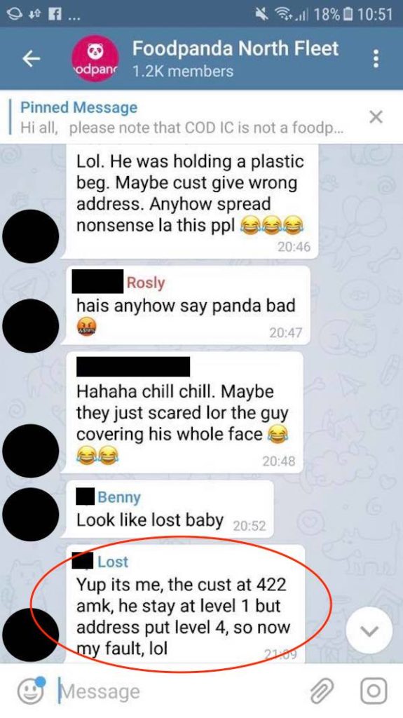 In yet another plot twist, a screen grab from an alleged WhatsApp chat group for Foodpanda delivery riders showed one man admitting to be the person in subject. According to his message, he went to the wrong unit of an HDB block in Ang Mo Kio — the address in his app was apparently displayed wrongly.