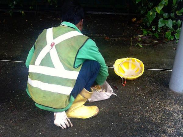 While waiting at the bus stop,I saw this poor worker squatting down on the wet floor(heavy rain just stopped) having his…