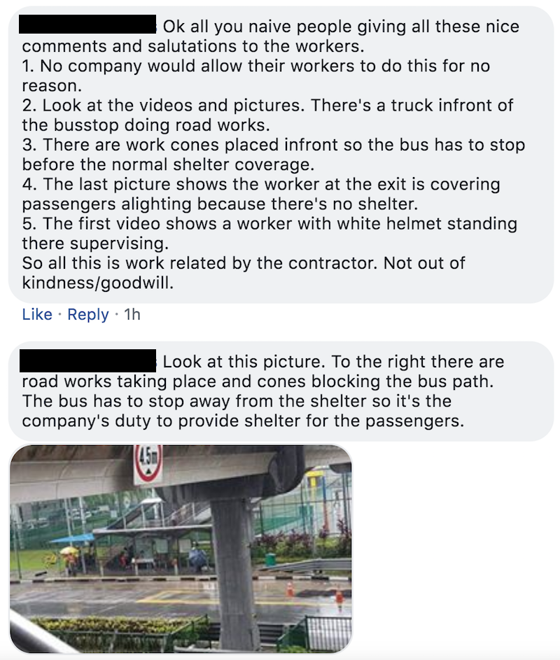 Subsequently, the man stayed for a while at the bus stop to observe. The duo — still donning their hard hats and work vests — would wait for buses to arrive at the stop along Sengkang East Way and step forward with open umbrellas to provide shelter to boarding and alighting passengers. It’s sad to note from the videos captured that some of the folks didn’t offer their thanks to the selfless workers.